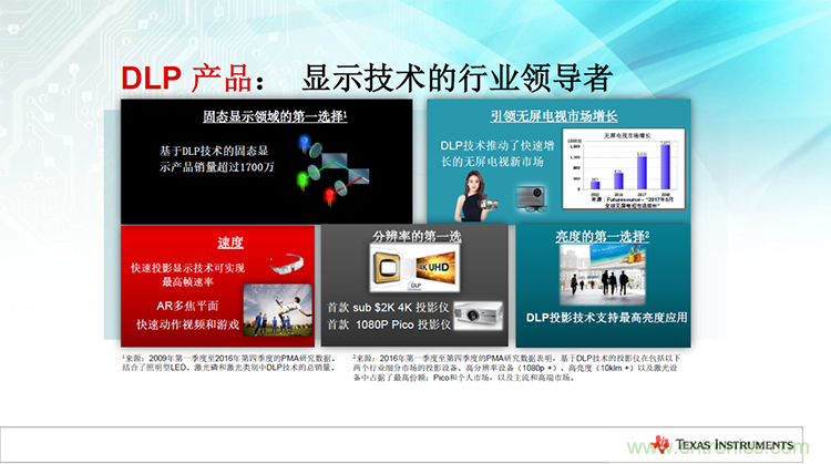 “在顯示應用領域,DLP技術涵蓋范圍非常廣,從小巧的口袋型顯示器到高端大型的數(shù)字影院,TI一直保持大量的產(chǎn)品和技術創(chuàng)新。”Ane Sacks女士在會議中介紹到,“如今,TI已經(jīng)能夠?qū)崿F(xiàn)最高幀速率和最高亮度的快速投影顯示技術,面向快速動作視頻和游戲市場;在面板分辨率上推出了入門級的4K平臺,與此同時在1080P上也有十足的創(chuàng)新,推出了超高性價比的1080p Pico解決方案,未來市場潛力巨大。”
