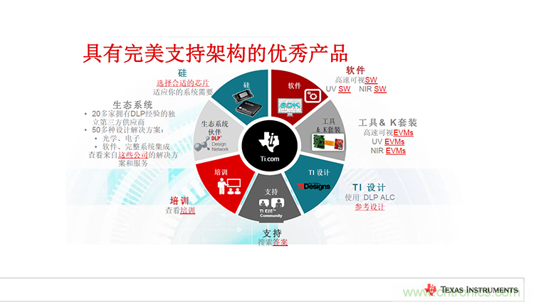 “為加速滲透民用主流市場,TI不僅推出了性能優(yōu)異的產(chǎn)品,還建立了一流的支持架構,以借助廣大TI用戶加快產(chǎn)品面市。”Ane Sacks女士還表示,“針對TI的IC和DLP芯片組,TI可以提供軟件、工具套件、參考設計、工程社區(qū)交流、技術培訓以及完善的DLP生態(tài)系統(tǒng)等技術支持,包含20多家擁有DLP經(jīng)驗的獨立第三方供應商以及50多種光學、電子、軟件等方面的設計解決方案,能夠?qū)⒆钚碌膭?chuàng)新、產(chǎn)品和應用及時、快速地傳遞給客戶。”