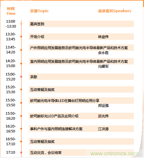 本次研討會特邀新曄電子市場總監(jiān)林俊偉、歐司朗光電半導體通用照明事業(yè)部市場工程師余永勝、歐司朗光電半導體市場部經理馮耀軍、歐司朗光電半導體多元市場事業(yè)部中國區(qū)市場工程師鄭運強、歐司朗光電半導體通用照明事業(yè)部高級應用工程師遲光偉、泰科工業(yè)事業(yè)部亞太區(qū)資深照明領域產品經理江洪濤等,他們將在現(xiàn)場為大家具體解讀LED舞臺照明領域的最新技術進展與市場趨勢。