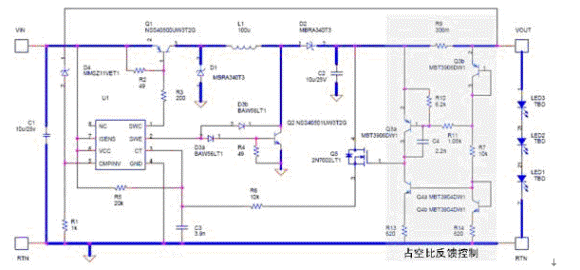 除了單純的降壓或升壓拓撲結構,在某些環境下,也需要降壓-升壓拓撲結構,如從標準電源輸入端驅動LED串;此外,在輸入電壓和LED負載電壓交疊的場合中使用這種拓撲結構也很常見。而NCP3065也能夠配置為降壓-升壓控制器。這種架構需要2個電源開關。雖然NCP3065本身也包含1個電源開關,但我們可以使用1個低VCEsat PNP/NPN對管來獲得更高轉換效率。這是一種可擴展的方案,整流器和電源開關都能夠根據具體的輸入和輸出電壓以及電流電平來調整。值得一提的是,諸如NSS40500UW3這樣的低VCEsat晶體管采用小巧的2×2 mm封裝,提供極佳的性能。