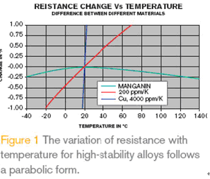 圖1 是錳鎳銅合金電阻的典型溫度特性曲線,溫度系數(shù)TCR單位為ppm/K,在20或25°C 時,TCR=[R(T)-R(T0)]/R(T0) ×(T-T0),對于溫度系數(shù)的定義,制造商標(biāo)明溫度的上限是必要的,舉例說明在+20 -+60°C的溫度范圍內(nèi),測量系統(tǒng)經(jīng)常選用TCR為幾百個ppm/K 的低阻值的厚膜電阻器,圖1中紅色曲線表示TCR 為200 ppm/K的電阻器的溫度特性,即使在如此小的范圍內(nèi),+50°C的溫度變化就足以導(dǎo)致阻值變化超過1%,這樣的電阻是不能用于精確電流測量的,有些測量設(shè)備制造商甚至使用PCB走線的銅膜作為電流取樣電阻,銅的TCR是4000 ppm/K(or 0.4%/K),2.5°C的溫度變化就足以造成1%的誤差。