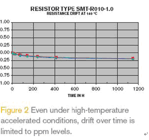 圖2 是表面貼裝電阻的典型長期穩(wěn)定性曲線,可以看出在140°C下老化1000小時后阻值只有大約 0.2%的輕微漂移,這是由于生產(chǎn)過程中輕微變形而導(dǎo)致的晶格缺損造成的。阻值漂移很大程度上由高溫決定,因此在較低的溫度下比如+100°C,這種漂移實際是檢測不出來的。