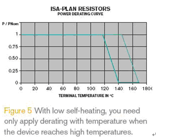 這種結(jié)構(gòu)的電阻可以在非常高的溫度下滿負(fù)荷工作,如圖5所示在很高的溫度下才出現(xiàn)功率折減;同時,電阻材料的溫度可以維持在較低水平,這就可以有效改善電阻的長期穩(wěn)定性和因溫度而引起的阻值變化。