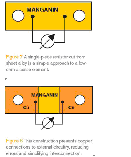 四引線設(shè)計推薦用于大電流和低阻值應(yīng)用。通常的做法使用錳鎳銅合金帶直接沖壓成電阻器(圖7),但這不是最好的辦法。盡管四引線電阻有利于改進(jìn)溫度特性和熱電壓,但總阻值有時高出實際阻值2到3倍,這會導(dǎo)致難以接受的功率損耗和溫升。此外,電阻材料很難通過螺絲或焊接與銅連接,也會增加接觸電阻以及造成更大的損耗。