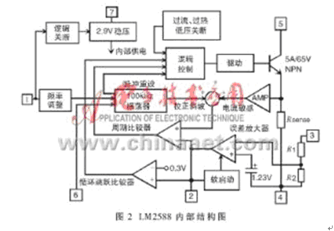 LM2588采用7腳TO-220封裝,主要包括100kHz振蕩器、2.9V穩壓電路、誤差放大器、5A/65V的NPN開關管以及過流、過熱、低電壓鎖定,還包括軟啟動、邏輯關斷、邏輯控制等,內部結構如圖2所示。