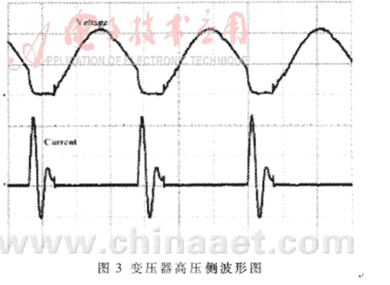 研制的高壓窄脈沖電源改善了高壓荷電系統的性能且穩定性好。實際運行表明,電源輸出電壓峰值為0~30kV,頻率為15kHz,脈寬為500ns~800ns。脈沖供電與直流供電相比,其起暈電壓低50%以上。此種電源功率變壓器的輸入頻率大幅度提高,同時變壓器和平波電抗器體積重量大為減小,且電源輸出紋波小、響應速度快。變壓器高壓側波形如圖3所示。