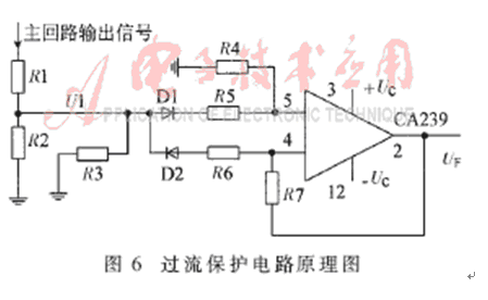 過電流保護電路的主要任務是檢測輸出電流的變化,并將其反饋到SG3525的控制端,在電流較大時可可靠關斷系統,以避免器件的損壞。其電路原理如圖6所示。圖中,電阻R1、R2對主電路的輸出進行采樣,當輸出電路中電流增大到設定值時,采樣電壓U1隨之增大,該信號經CA239反饋到SG3525的+V端,封鎖PWM脈沖。