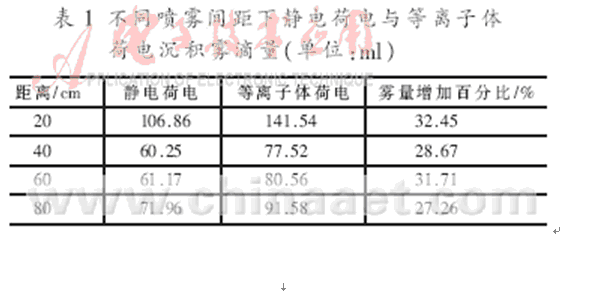 由表1可以看出,由于使用了等離子體荷電噴霧技術,農藥落在植株上的藥量有了明顯的增加,達到了設計要求。由表2可見,等離子體荷電與普通靜電噴霧相比,能在較小的放電電壓下得到較高的荷質比。從而降低了農藥的使用量,也減輕了對環境的污染。