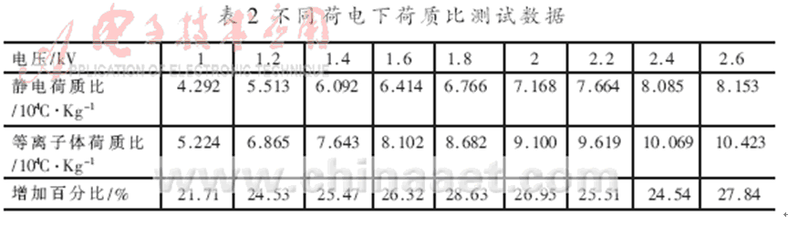 荷質比是衡量霧滴荷電性能的重要指標,荷質比越大,霧滴的荷電性能及充電效果越好,通過實驗手段可對霧滴荷電情況進行測量。不同荷電情況下荷質比測試數據如表2所示。