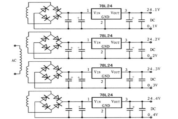 驅動電路需要4路相互隔離的直流電源為4路IGBT驅動電路供電,用220V/22V變壓器對4路交流電源分別整流,用電容器和78L24型電壓調整器穩壓后輸出4路24V直流電壓,如圖2所示。