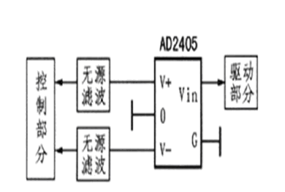 控制電路為弱電部分,極易受到干擾;驅動電路直接與外電路連接,是一個較強的干擾源;為了實現整個設備的電磁兼容,控制電路部分必須與驅動部分隔離。為了避免公共電源對控制電路產生干擾,應對控制電路及驅動電路分別供電,EXB84l的電源電壓為+20 V,一般控制電路的供電電壓為5 V,因此,可以利用圖4所示的DC-DC微功率模塊進行電源隔離,采A2405D型微功率模塊實現電源的隔離。