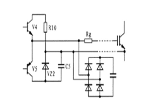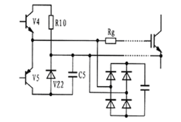 圖5所示為EXB841與IGBT柵-射極之間的連接電路原理圖。當驅動電路中的V4導通時,IGBT處于正常導通狀態,當V5導通時,IGBT柵-射極之間通過穩壓管VZ2提供一個-5V電壓加在其兩端,使IGBT關斷,此時V5處于臨界導通狀態,穩壓管VZ2處于反向偏置狀態。但由于集-柵極之間分布電容的影響,集-柵極之間的du/dt增大時,其通過分布電容形成的電流經過,所以,要克服集-柵極之間的du/dt,確保穩壓管不過壓,避免IGBT誤導通。克服du/dt的方法有二種:一是驅動電路輸出與IGBT柵-射極之間的連線采用雙絞屏蔽電纜,屏蔽層接地,二是采用快速吸收電路吸收過電壓。
