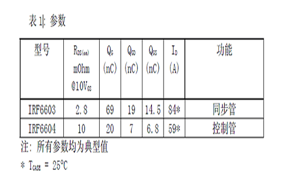 此設計可以高效輸出超過100A(>25A/相)的電流而面積只有95mm×31mm(3.8inch X 1.25inch )。每項均使用一個控制管和一個同步管的DirectFET MOSFET。用作控制管和同步管的30V DirectFET的規格見表1。請注意它們高的載流能力省去了器件并聯的需要。