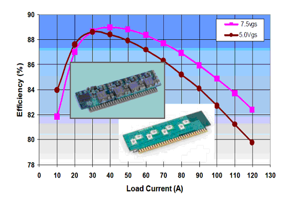 VRM線路板被重新設計,用4Oz厚覆銅,進一步減小PCB走線電阻,改善熱性能。圖2所示為這款4Oz厚覆銅板的VRM,在500KHz工作頻率,12V輸入電壓,1.7V輸出電壓,600LFM風冷的條件下的效率曲線。在一個很寬的負載電流范圍內,7.5V柵驅動電壓表現出更高的效率。此款VRM在最大負載電流120A時,效率達到82%。