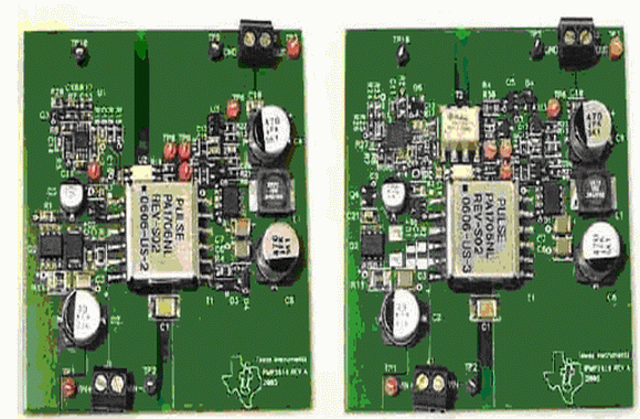 在高功率應(yīng)用中,越來越多的人選用有源鉗位正向轉(zhuǎn)換器。然而,只有極少數(shù)電源設(shè)計人員能夠意識到他們同樣可以在反向轉(zhuǎn)換器中使用有源鉗位。為了找出在反向拓?fù)浣Y(jié)構(gòu)中采用有源鉗位控制的益處,我們根據(jù)表 1 中的規(guī)范設(shè)計、構(gòu)建并測試了兩個電源。這兩個電源均使用次級同步整流,但是其中一個使用電源變壓器來驅(qū)動同步 FET,另一個則使用一個柵極驅(qū)動變壓器并且還采用了一個有源鉗位。POE 輸入要求產(chǎn)生了許多規(guī)范,但是我們可以擴大其輸入范圍以實現(xiàn)在電信領(lǐng)域的應(yīng)用。為了公平比較起見,我們使主要組件不受該兩種設(shè)計中使用兩種完全一致的方法所產(chǎn)生的不同差異的影響,圖 1 給出了每個電路的圖片。我們還需使兩個電路板中組件的安放位置和布局一樣。在這兩個電路中,最值得注意的不同點是有源鉗位電路中柵極驅(qū)動變壓器的添加。
