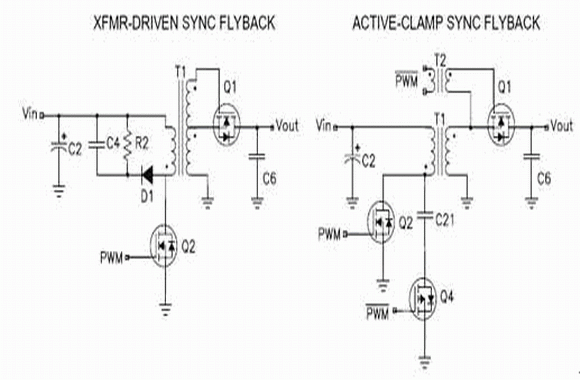 圖1-兩種電源均使用了次級同步整流,但是左邊的電源使用電源變壓器來驅(qū)動同步 FET,而右邊的電源則使用一個柵極驅(qū)動變壓器并且還采用了一個有源鉗位。
