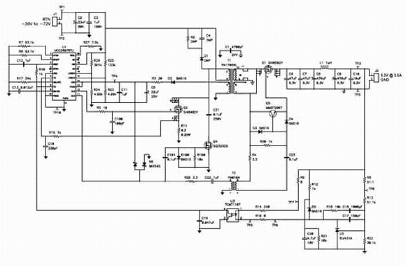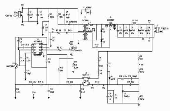 圖 3 顯示了傳統(tǒng)同步反向電源設(shè)計的完整原理圖。該設(shè)計使用了一個低成本、簡化的電流模式 PWM 控制器(即 UCC2809),對電源進(jìn)行控制。除了主緩沖器以外,該電路還需要D3 和 D4 的齊納鉗位電路,以防止來自漏極電感峰值的 Q1 超高柵-源電壓。