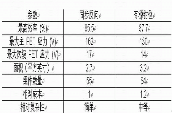 表 2 列出了對兩種同步反向電源主要部分進(jìn)行比較的總結(jié)。該表說明了有源鉗位反向電源相對于變壓器驅(qū)動同步反向電源在性能上的優(yōu)勢。尤其是在輕負(fù)載情況下,有源鉗位反向電源具有更低的 FET 電壓應(yīng)力及更高的效率。有源鉗位控制器 (UCC2897) 的可編程停滯時間特性(該特性可防止主、次級 FET 的疊加傳導(dǎo) (overlapping conduction))有助于最小化 Q1 二次側(cè)直通損耗。這些損耗一般表現(xiàn)為可在主電流感應(yīng)電阻器上觀測到的一個大電流峰值,且經(jīng)常會導(dǎo)致輕負(fù)載抖動的問題。有源鉗位反向電源較低的高頻振鈴會產(chǎn)生更少的 EMI 及一個全局范圍內(nèi)更低噪聲的電源。由于漏極電感對有源鉗位電路性能的影響較小,因此,盡管同步反向電源并不是一無是處,但比起帶有同步反向的情況,高頻操作更有可能實現(xiàn)。在這兩個示例電路中,與有源鉗位反向電源相比,傳統(tǒng)的同步反向電源可將 PWB 面積、組件數(shù)量和成本上降低大約 15%~20%。這是一款容易設(shè)計和(可論證性地)理解的更簡單的電路,雖然如此,但還是要考慮到其在性能上的一些不足。那么,您應(yīng)該在什么時候選擇一個有源鉗位反向電源呢?如果輸出功率較低,同時設(shè)計要求一直進(jìn)行連續(xù)模式運行,那么有源鉗位反向電源可以實現(xiàn)高效率、低 EMI 運行。在輕負(fù)載效率較為關(guān)鍵的應(yīng)用中,它具有一個更為明顯的優(yōu)勢。