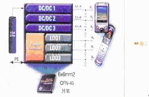 圖2是TI公司的一種電源管理IC(TPS65021)的功能結構示意圖。它由1節鋰離子電池供電,由微處理器通過I2C與器件接口。TPS65021內部有控制功能電路及6個電源(3個DC/DC轉換器,3個線性穩壓器LDO,輸出V1-V6電壓)。它可以給手機供電及實現負載管理。