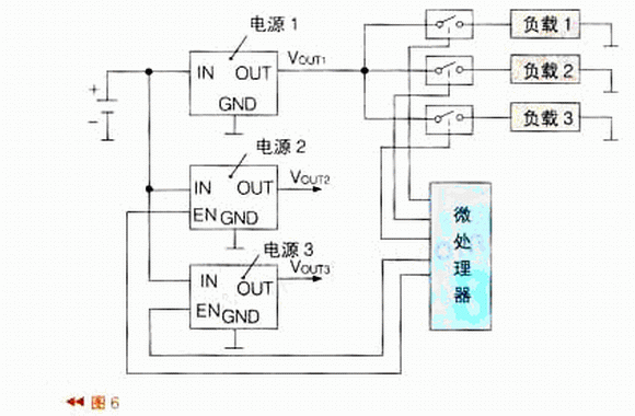 由微處理器及N個負載開關及N個負載組成的負載管理結構框圖如圖5所示。各個負載開關接在電源與負載之間,其ON/OFF端與微處理器的I/O口連接。在不同的工作狀態時,由微處理器給各個負載開關的ON/OFF端輸出邏輯電平;輸入高電平的負載得電,輸入低電平的負載失電。采用這種方案也能實現負載管理,主要用于一個電源帶多個負載的產品中。