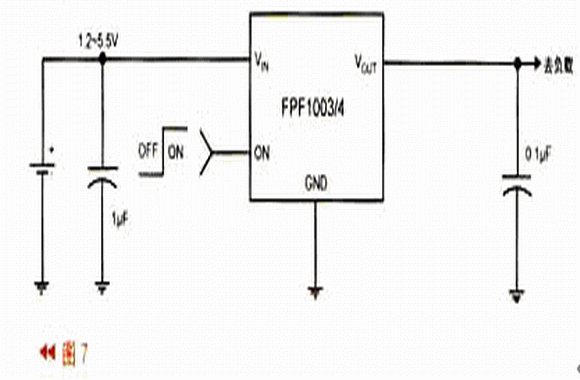 該器件典型應用電路如圖7所示,輸入電容一般為1μF,輸出電容為0.1μF(都采用多層陶瓷電容器)。如在ON端加邏輯高電平時,開關導通(VIN=1.2V時,VIH≥0.8V;VIN=2.7~5.5V時,VIH≥2V);ON端加邏輯低電平時,開關關斷(VIN=1.2V時,VIL≤0.35V;VIN=2.7V~5.5V時,VIL≤0.8V)。RDS(on)與VIN有關:VIN=5.5V時,RDS(on)≤30MΩ;VIN=1.2V時,RDS(on)≤150MΩ。