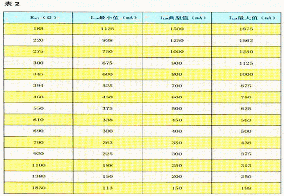 限制電流ILIM的設定與RSET有關,其關系式為:RSET=275.6/ILIM。式中RSET的單位為歐姆,ILIM的單位為安培。設定的限制電流有一定的允差,如表2所示。