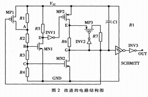 改進的電路如圖2所示,電路結構由采樣、先導控制、比較器、遲滯反饋回路、加速響應電路、緩沖器六部分構成。電阻R1、R2、R3、R4構成分壓電阻網絡實現對Vcc的采樣;MNl、R5、INVl組成先導控制電路,實現對比較器灌電流的控制;MN2、R6、MP2組成比較器,實現采樣電壓與MN2的VTH比較;MP1構成正反饋回路,可實現Vcc的遲滯功能;INV2、MP3、R7構成正反饋回路,可加速比較器的翻轉,從而提高電路的響應速度;SCHMITT觸發器和INV3是緩沖電路,對比較器的輸出波形進行緩沖和整形,SCHMITT觸發器的結構如圖3所示,其工作原理詳見參考文獻[3];另外,電容C1起濾波和儲能作用。