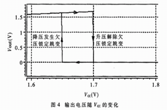 從圖4的仿真的波形中可以看出:當增大電源電壓時,電壓低于1.7V為欠壓鎖定;當減小電源電壓時,電壓低于1.65V為欠壓鎖定。仍可進一步調整參數,以改變電源電壓欠壓閾值。