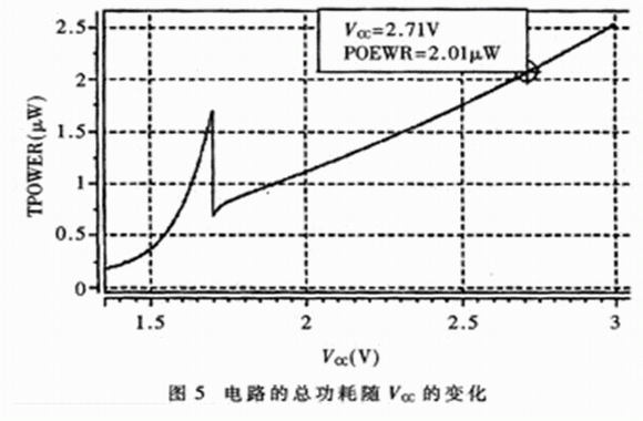 從圖5的仿真波形中可以看出:當Vcc的電壓正常時,電路的總功耗隨著Vcc的升高而增大,當Vcc=2.7V時,總功耗約為2μW,可見電路的靜態功耗很低。
