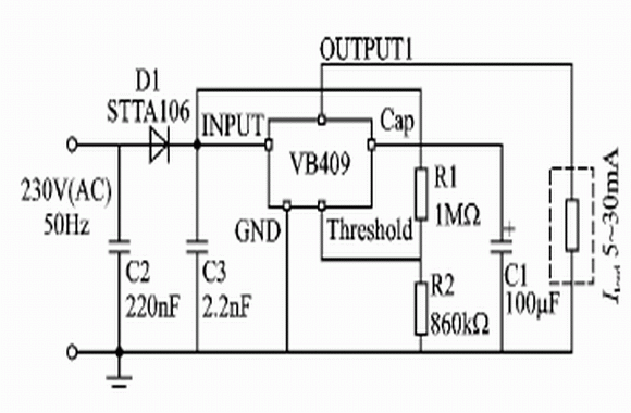 在小型的MCU應用系統中,采用AC 220V供電時,一般要使用變壓器對電源進行處理,將高壓交流電降到低壓后再進行直流處理,或者將交流電變為高壓直流電后再進行高頻變換,以得到MCU系統的工作電源。這對于結構沒有特殊要求的系統,在設計上屬于常規的問題,使用上述的線性電源技術或者開關電源技術,均能得到方便的解決。但是有些MCU應用系統在體積上要求極其小巧,甚至不能安放變壓器,所以常規的電源處理就不能滿足其要求了。因此,使用能夠直接接收高壓交流電并將其直接變換成低壓直流的技術,是最佳的設計選擇。VB409的出現有望實現這一設計思路。