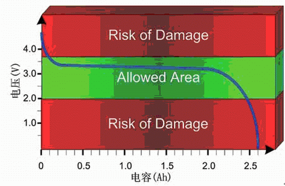 一旦電壓超出允許范圍,鋰電池很容易被損壞(見圖1)。如果超出電壓的上限和下限(例如,nanophosphate鋰電池的電壓上限和下限分別為3.6V和2V),電池就可能會受到不可逆的損壞,至少也會增加電池的自放電率。在相當寬的荷電狀態范圍內,輸出電壓可以保持穩定,因此正常情況下超出安全范圍的可能性比較小。但是,在接近安全范圍上限和下限的區域,變化曲線非常陡峭。作為預防措施,仔細監測電壓水平非常必要。