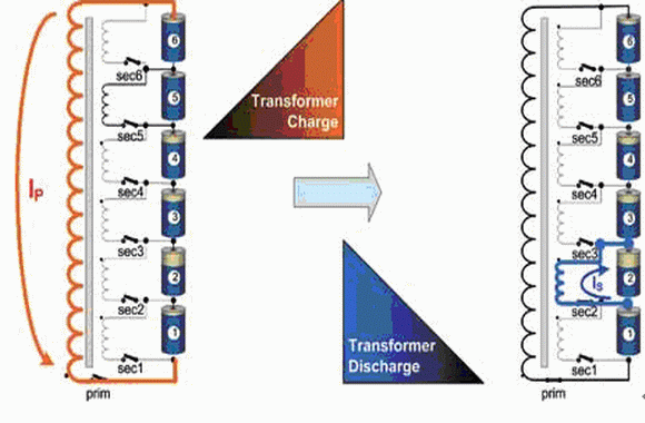 圖4所示的例子說明了上限平衡模式下的能量流動情況。在電壓檢測后,確認5號電池是電池組中電壓最高的電池。閉合5號次繞組開關,電流由5號電池流向變壓器。由于電感效應,電流隨時間線性增大。鑒于電感是變壓器的固定特性,最大電流值由開關閉合的時間決定。從5號電池中轉移出來的能量被存儲在變壓器的磁場中。斷開5號次繞組開關,閉合主繞組開關,此時變壓器轉入發電機工作模式,能量通過大型主繞組饋入電池組。
