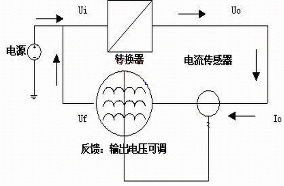 在能量反饋部分就要能實(shí)現(xiàn)上述要求,保證穩(wěn)定的電能轉(zhuǎn)換器的輸出電流,采用電流傳感器檢測電能轉(zhuǎn)換器的輸出電流,同時反饋部分采用反饋電壓與輸出控制電流之間成反比系數(shù)關(guān)系即Uf∝K/Io,為便于分析,設(shè)電源電壓Ui為穩(wěn)定值。當(dāng)輸出電流較小時,通過調(diào)節(jié)反饋電壓,使其變大,則反饋電壓與輸入的電壓差△U=Uf-Ui變大, 相應(yīng)的由反饋電壓流向輸入電壓的電流加大,造成相應(yīng)的反饋功率加大;當(dāng)輸出電流較大時,通過調(diào)節(jié)反饋電壓,使Uf變小,則反饋電壓與輸入的電壓差△U變小,相應(yīng)的由反饋電壓流向輸入電壓的電流減小,造成循環(huán)的功率減小;整個過程維持負(fù)反饋控制,最終達(dá)到動態(tài)平衡,維持設(shè)定的額定功率。
