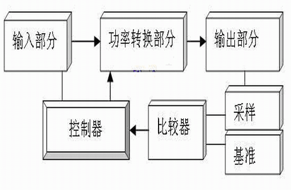 從以上能量反饋系統(tǒng)工作分析可知,能量反饋部分為系統(tǒng)穩(wěn)定工作提供必要的保證, 能量反饋部分組成可由圖5所示,主要包括:輸入部分、功率轉(zhuǎn)換部分、輸出部分、采樣、基準(zhǔn)、比較器和控制器七個組成部分。
