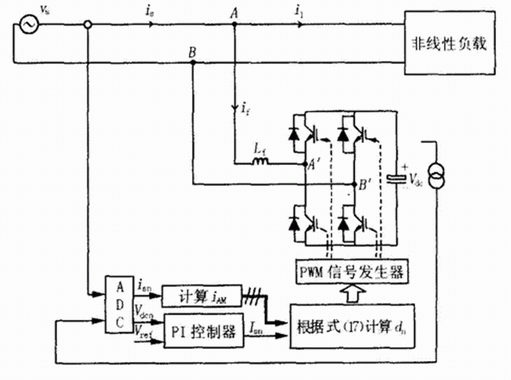 基于式(17)可以實現有源濾波器的數字化控制,其基本結構如圖2所示,在一個開關周期內控制器首先采樣系統電流is和直流側電容電壓Vdc,經AD轉換器轉化為數字量isn、Vdcn,而Vdcn與直流電壓Vref參考值經過數字PI調節器生成Isn,然后利用式(17)計算出橋臂開關的占空比dn送入PWM發生器,經驅動電路控制開關的動作。