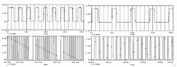 從模擬結果可以看出,此PFM控制電路的實現方式在輕負載下,可以有效降低轉換器的損耗,提高運行效率。