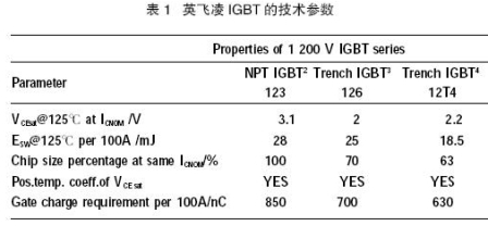 英飛凌的3 個(gè)主要IGBT 技術(shù)系列的最重要的專用參數(shù)如表1 所列,它們都為1 200 V SEMI原TRANS模塊所使用。