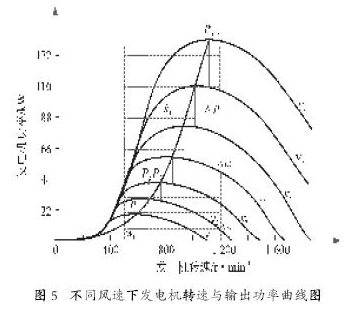 風(fēng)力機(jī)通過(guò)葉輪來(lái)捕獲流動(dòng)的風(fēng)能,風(fēng)的能量轉(zhuǎn)化為葉輪旋轉(zhuǎn)的動(dòng)能,齒輪箱再把這種機(jī)械能傳輸?shù)桨l(fā)電機(jī),由發(fā)電機(jī)通過(guò)內(nèi)部的電磁關(guān)系將機(jī)械能變?yōu)殡娔茌敵觥D5為在不同風(fēng)速下,葉輪轉(zhuǎn)速與風(fēng)力機(jī)輸出功率的關(guān)系圖。由圖可知,對(duì)應(yīng)于每個(gè)風(fēng)速的曲線,都有一個(gè)最大輸出功率點(diǎn),風(fēng)速越高,輸出功率越高,相應(yīng)的葉輪轉(zhuǎn)速也越高。因此,如果能隨風(fēng)速變化改變?nèi)~輪轉(zhuǎn)速,使得風(fēng)力機(jī)在所有風(fēng)速下都工作于最大功率輸出點(diǎn),則發(fā)出電能最多,否則發(fā)電效能將降低。