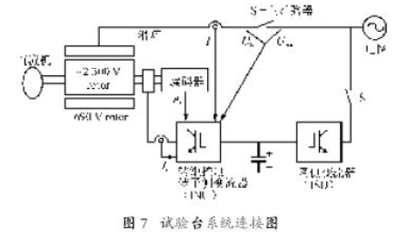 上海南洋電機(jī)廠采用ACS800-67 變頻器構(gòu)建雙饋風(fēng)力發(fā)電機(jī)的實(shí)驗(yàn)平臺(tái),風(fēng)力機(jī)采用直流電動(dòng)機(jī)模擬,即雙饋發(fā)電機(jī)轉(zhuǎn)子靠直流電動(dòng)機(jī)拖動(dòng)。系統(tǒng)連接示意圖如圖7所示。技術(shù)數(shù)據(jù)如下:發(fā)電機(jī)定子額定電壓690 V,定子額定電流1500A,額定頻率50 Hz,額定功率1 345kW,額定轉(zhuǎn)速1 513 r/min,同步轉(zhuǎn)速1 500 r/min,功率因數(shù)0.9,轉(zhuǎn)子開(kāi)路電壓1990V,轉(zhuǎn)子電流550A;變頻器型號(hào)ACS800-67-0480/0770-7,調(diào)速范圍±30%。