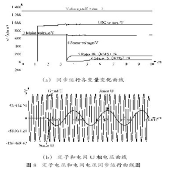 圖8(b)所示為電網(wǎng)U 相電壓與定子U 相電壓在同步過(guò)程中的變化曲線。由圖可知,當(dāng)變頻器投入運(yùn)行后,定子U 相電壓迅速建立,并與電網(wǎng)U 相電壓在相位、幅值上完全一致,達(dá)到同步的要求。
