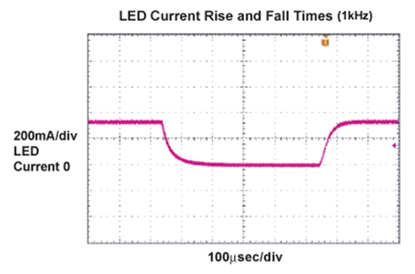 控制LED燈源亮度的最好辦法是通過一個低頻PWM脈沖調制LED電流。使用這種方法,LED電流根據占空比的變化觸發脈沖,同時保持電流幅度恒定。這樣,器件發出的光波波長在整個調節范圍內保持不變。