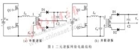 用兩個元件組成的諧振拓樸結構主要有兩種:并聯(lián)結構和串聯(lián)結構,分別如圖1(a)和圖1(b)所示。串聯(lián)諧振在輕負載時具有較高的效率,而在滿負載時轉換效率比較低;并聯(lián)諧振則反之,在滿負載時具有較高的轉換效率,而在輕負載時轉換效率比較低。而且串聯(lián)諧振和并聯(lián)諧振都要求較寬的頻率范圍。因此,這種二元的諧振網絡在實際應用中都有一定的限制。