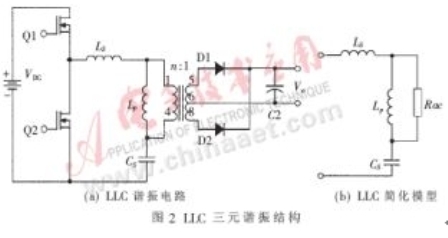 在二元件諧振網絡的基礎上,根據不同的應用可構建不同種類的三元件的諧振網絡。三元件諧振網絡與二元件諧振網絡相比有很多優(yōu)點,比如在全負載范圍內都具有較高的轉換效率,而且頻率變化范圍比較窄等。本文主要介紹和分析由三元件LLC構成的諧振網絡,其結構如圖2(a)所示。