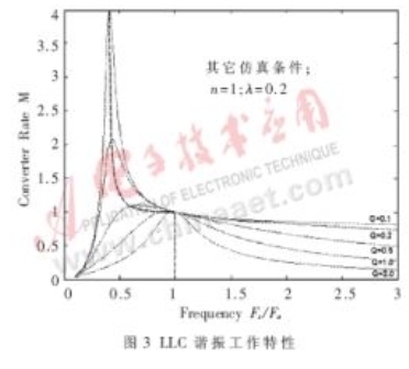 從圖3中可以看到,在整個頻率范圍內,既有降壓的工作區(qū)域(M<1),也有升壓的工作區(qū)域(M>1),因此LLC諧振有著較為廣闊的應用范圍。在輕負載時,工作頻率逐漸升高,工作在降壓區(qū)域內;而在重負載時,工作頻率逐漸降低,工作在升壓區(qū)域內。眾所周知,串聯(lián)諧振的工作區(qū)域是Fs/Fo>1,才能工作在ZVS的狀態(tài)下。從圖3中可以看到,在不同負載(即Q不同)下,為獲得ZVS的工作條件,只要使之工作在虛線的右側即可。而LLC諧振不僅僅局限于Fs/Fo>1區(qū)域,在某些負載下可以工作在Fs/Fo<1區(qū)域,同樣可以獲得零電壓轉換的工作狀況。并且與串聯(lián)諧振相比,在不同負載時的頻率變化范圍更小。因此,LLC諧振網絡有著其自身獨特的優(yōu)點。