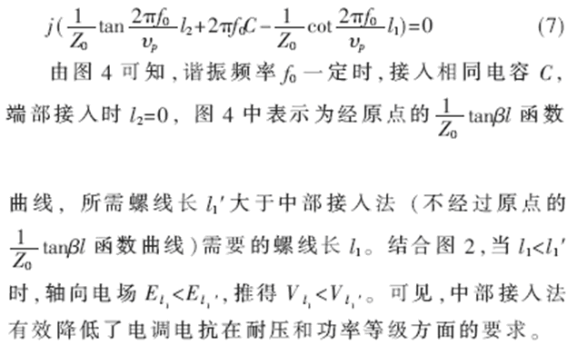 由圖2可知,軸向電場能量以sin2βz形式分布,開路端電場能量最為集中。端部加載時,加載電抗將不得不承受高電壓。例如,Qu=6000、30MHz、3dB帶寬為50kHz的螺旋濾波器,在RL=50Ω,傳輸功率45kW時,螺線端部電壓將達(dá)75kV。這給電調(diào)器件提出了相當(dāng)高甚至難以達(dá)到的耐壓要求。