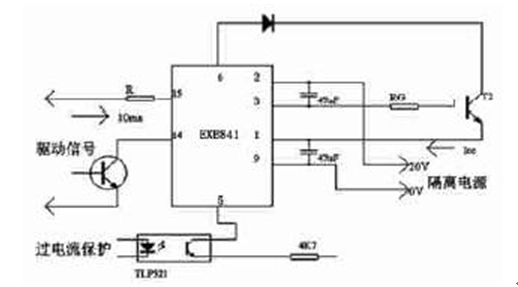 EXB84 系列為日本富士公司推出的IGBT專用芯片,能驅(qū)動高達(dá)300A/1200V 的IGBT。它具有隔離強(qiáng)度高、反應(yīng)速度快、參數(shù)一致性好、具有防擎住效應(yīng)的緩關(guān)斷電路等優(yōu)點(diǎn),并可以對IGBT實(shí)施過流保護(hù)。模塊內(nèi)功能較全,用+20V 直流電源供電,能產(chǎn)生+15V 開柵電壓和-5V 關(guān)柵電壓,內(nèi)裝TLP550 高速光耦信號隔離電路。如圖1。電路的內(nèi)部還集成有過流檢測電路和慢速過流切斷電路,其過流檢測電路按驅(qū)動與集電極電壓之間的關(guān)系檢測過流。當(dāng)流過IGBT的電流超過內(nèi)部設(shè)定值時,慢速切換電路以不使IGBT 損壞的較慢速度關(guān)斷IGBT。其中,為了防止IGBT集電極產(chǎn)生大的電壓尖脈沖,在柵極串聯(lián)電阻RG、47 F 電解電容器吸收由于電流源接線電阻引起的供電電壓變化,而不是電源濾波器的電容器。