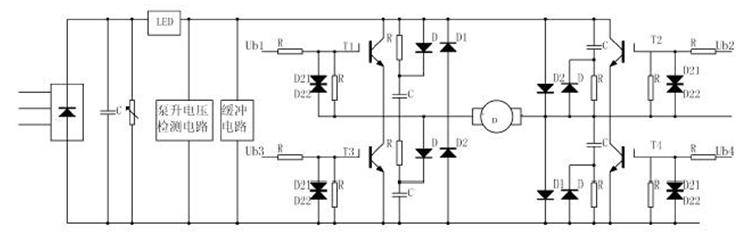 電機(jī)停車或減速時工作在制動狀態(tài),儲存在電機(jī)和負(fù)載運(yùn)動部分的動能將變成電能,并通過PWM 變換器回饋給直流電源。系統(tǒng)有不可控的整流器供電,不能向電網(wǎng)回饋電能,只好對電容器C 充電而使泵升電壓升高,過高的泵升電壓有可能擊穿變換元件。泵升電壓檢測電路如圖3。