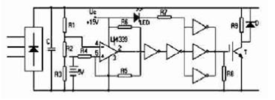 設(shè)UDC為電力電容C1 兩端的電壓,電壓比較電路直接檢測該電壓,與被測值超過設(shè)定允許值時,電壓比較器反轉(zhuǎn), 觸發(fā)制動單元VB 導(dǎo)通,電力電容上的電荷經(jīng)R 釋放,使電壓降低,反之,當(dāng)該電壓低于設(shè)定允許值時,電壓比較器翻轉(zhuǎn)回原先狀態(tài),輸出端為高電壓,經(jīng)邏輯轉(zhuǎn)換后關(guān)斷UB 。由于比較器為OC 門輸出,該端電壓近乎電源電壓UC。