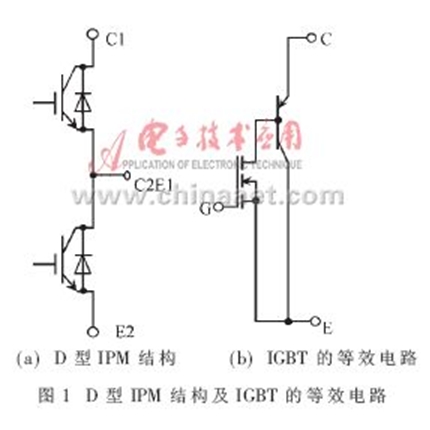 IPM由高速、低功率的IGBT芯片和優(yōu)選的門級驅(qū)動(dòng)及保護(hù)電路構(gòu)成,如圖1所示。其中,IGBT是GTR和MOSFET的復(fù)合,由MOSFET驅(qū)動(dòng)GTR,因而IGBT具有兩者的優(yōu)點(diǎn)。