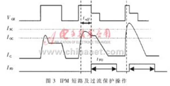 ,大多數(shù)IPM采用兩級關(guān)斷模式,過流保護(hù)和短路保護(hù)操作可參見圖3。其中,VG為內(nèi)部門極驅(qū)動(dòng)電壓,ISC為短路電流值,IOC為過流電流值,IC為集電極電流,IFO為故障輸出電流。